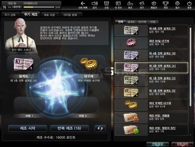 Seorang pemain harus memiliki resep senjata dan barang tahan lama untuk memulai manufaktur. Manufaktur senjata akan memerlukan beberapa poin game, biaya akan tergantung pada jenis senjata yang akan dibuat.