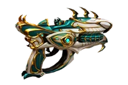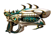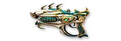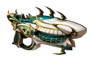- Due to the gold chrome texture, the cyan color of the weapon model becomes turquoise in-game.